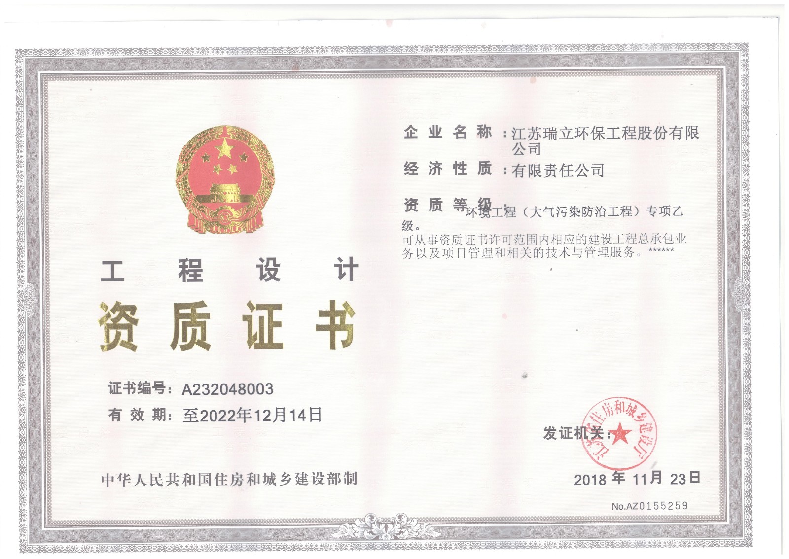 瑞立環保 · 資質榮譽公司取得了環保專業承包資質、ISO9001質量管理體系認證、環保工程設計資質、高新技術企業等。